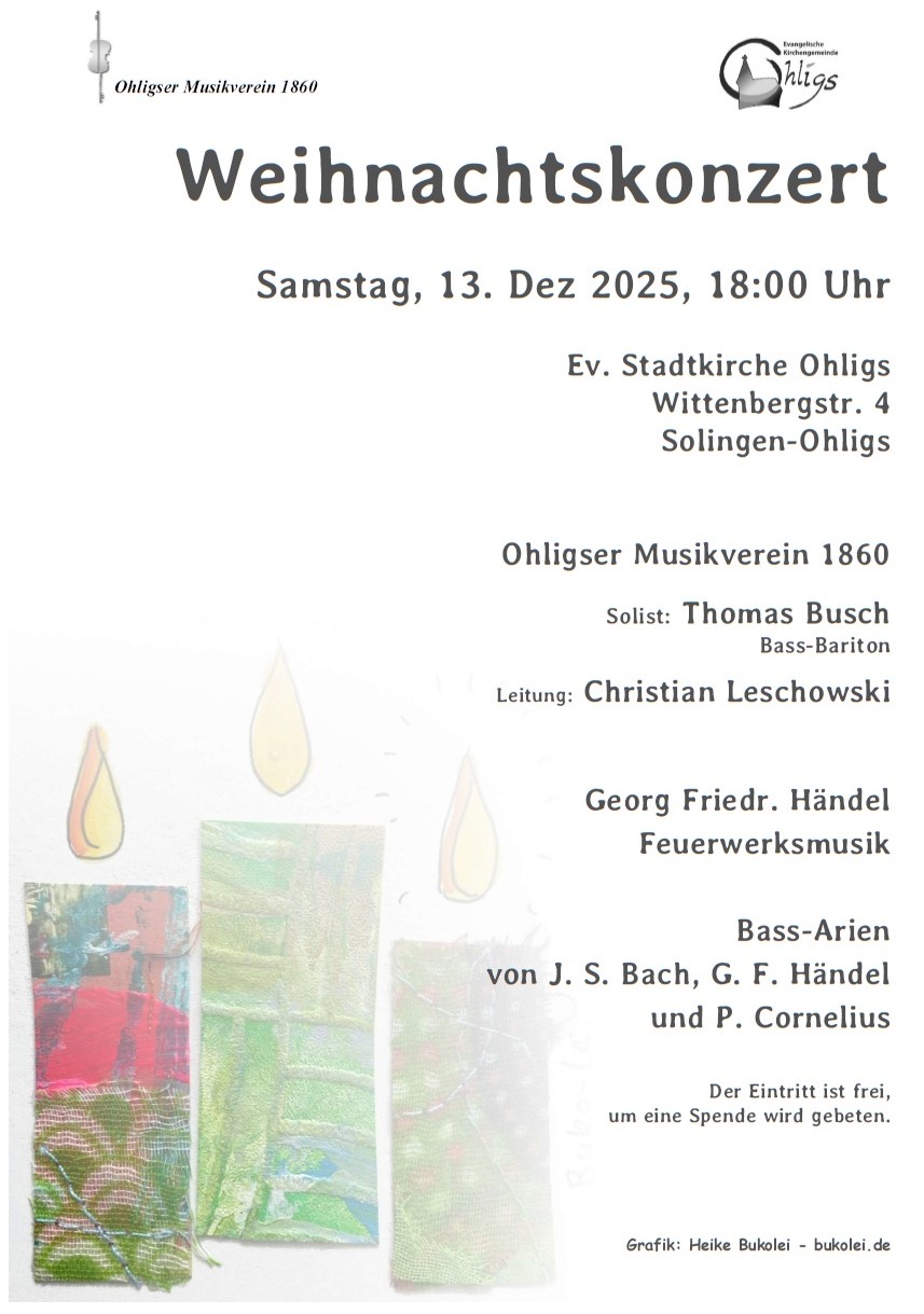 Achtung: Das Konzert wird in der Stadtkirche in Solingen Ohligs (Wittenbergstr. 6) stattfinden. In diesem Jahr freuen wir uns, Thomas Busch (Bass-Bariton) als Solisten begrüßen zu dürfen. Neben der Feuerwerksmusik (G.F. Händel) werden wir Bass Arien von G.F. Händel, J.S. Bach und P. Cornelius aufführen. Thomas Busch, studierte zunächst evangelische Kirchenmusik an der Robert-Schumann-Hochschule in Düsseldorf und anschließend Gesang an der Folkwanghochschule in Essen. Er war Stipendiat der "Società dell´Opera Buffa" in Mailand und zweiter Preisträger beim "Concorso Internazionale Angelica Catalani" in Italien in der Sparte Lied. Beim "Corso Internazionale di Musica Vocale da Camera“ in Conegliano wurde er von der Universität Ca‘ Foscari, Venedig mit einem Stipendium ausgezeichnet. Neben seiner Tätigkeit als Oratoriensänger, sang er an den Opernhäusern in Düsseldorf und Aachen und war in verschiedenen Theatern Italiens zu hören. Seine besondere Vorliebe gilt dem Liedgesang. Sein umfangreiches Repertoire interpretiert er regelmäßig im In- und Ausland. Gemeinsam mit dem Pianisten Stephan Lux hat er die Lieder des romantischen Komponisten Friedrich Lux auf CD eingespielt. Thomas Busch unterrichtet die Klasse für Musica Vocale da Camera (Liedgestaltung) am Konservatorium im italienischen Mantua.